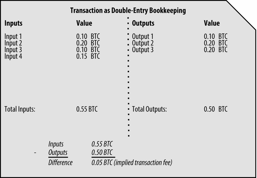 Questo consente ad un’applicazione wallet bitcoin di precompilare le informazioni usate per inviare il pagamento e allo stesso tempo mostrare all’utente una descrizione leggibile dell’operazione. Marco usa il suo Iphone per scansionare il QR code così facendo il suo iphone mostra a schermo un pagamento di 0.015 BTC verso il negozio di Giovanni, a questo punto Marco non dovrà far altro che selezionare a schermo “invia” così da autorizzare la transazione. Pochi istanti dopo Giovanni è in grado di vedere la transazione ed in questo momento la transazione è completata. Le transazioni sono come righe in un registro di contabilità in partita doppia. Ogni transazione è una serie di input e output, che non sono altro che i crediti e debiti.